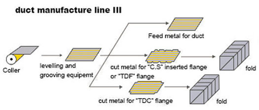生產(chǎn)Ⅲ線是由上料架、調(diào)平壓筋機(jī)、沖尖口和沖方口油壓機(jī)、液壓剪板機(jī)、液壓折邊機(jī)所組成。電器控制部分采用全電腦控制,該控制系統(tǒng)具有閉環(huán)反饋系統(tǒng),生產(chǎn)精度和穩(wěn)定性明顯升高。其大工作速度為10米/分。長(zhǎng)度誤差為±0.5mm,對(duì)角線誤差 ±0.8mm。 本系統(tǒng)可單班生產(chǎn)1000M2方型風(fēng)管能力。